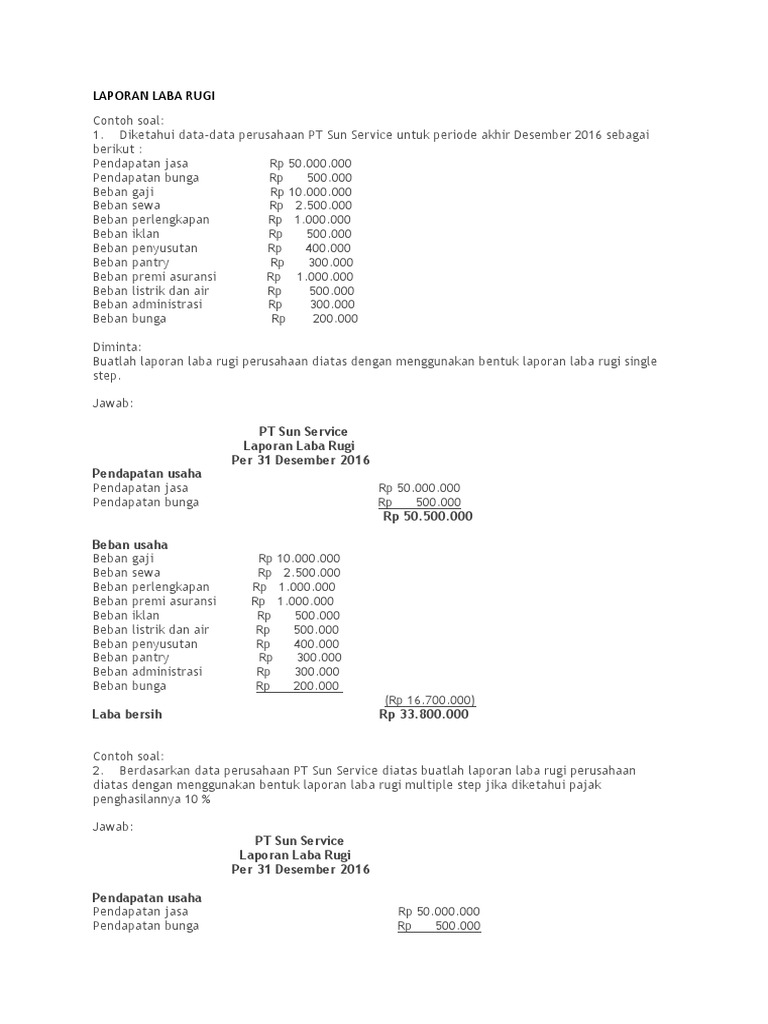 Penghasilan atau beban ini menjadi beberapa data yang tidak bisa diukur dengan detail pada contoh soal laporan laba rugi yang komprehensif. Secara umum terdapat 3 perusahaan yang memperlukan laporan laba rugi yakni perusahaan jasa, perusahaan dagang dan perusahaan manufaktur. Contoh soal akuntansi perusahaan manufaktur memuat tentang persediaan bahan baku berupa persediaan untuk proses produksi persediaan bahan laporan keuangan terdiri dari neraca laporan laba rugi dan laporan perubahan posisi keuangan. Untuk contoh laporan laba rugi pada industri manufaktur bisa dilihat di bawah ini. Sentosa jaya tbk adalah perusahaan yang menghasilkan dan menjual produk dalam 2 jenis berbeda yaitu jenis ab. Laporan laba rugi menyajikan rincian informasi mengenai penghasilan, beban, laba dan rugi perusahaan pada periode akuntansi tertentu. Servis sepeda motor halaya laporan laba rugi periode juni 2017. Agar lebih jelas berikut ini ada contoh soal laporan laba rugi perusahaan manufaktur Contoh laporan laba rugi | suatu perusahaan di akhir periode akan membuat yang namanya laporan laba rugi. #laporan keuangan#labarugi#akuntansiperusahaanmanufaktur berisi penjelasan mengenai laporan keuangan laba rugi akuntansi perusahaan manufaktur. Laporan laba rugi dibuat untuk menghitung laba barsih perusahaan dengan mengurangi seluruh total pengeluaran dari total pendapatan tentunya sesuai fakta yang ada pada jurnal umum. Cari tahu tentang ✅ laporan laba rugi perusahaan dagang lengkap dengan ✅ contoh dan penjelasan. Contoh soal manufaktur berikut ini adalah neraca saldo yang telah disesuaikan, perusahaan iwagakure furniture pada tanggal 31 januari.